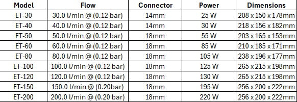 The ET series range of air pumps ensures that there is plenty of water movement in wastewater applications; this boosts oxygen levels in the water, allowing aerobic bacteria to decompose. When used in medical applications, the ET series provides a high flow at low pressure.